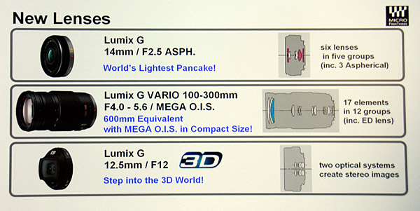 Il mirino elettronico offre una risoluzione di 1,5 millioni di punti, con copertura naturalmente al 100%. Panasonic ha annunciato anche nuovi obiettivi per il sistema LUMIX G Micro Quattro Terzi: Un 14mm F2.5, un 100-300mm F4-5,6 con stabilizzatore MEGA OISe l'obiettivo 12,5 F12 3D. Il marchio giapponese sta anche considerando l'allargamento del parco ottiche in futuro con un obiettivo 25mm F1.4 e con ottiche più luminose e grandangolari.