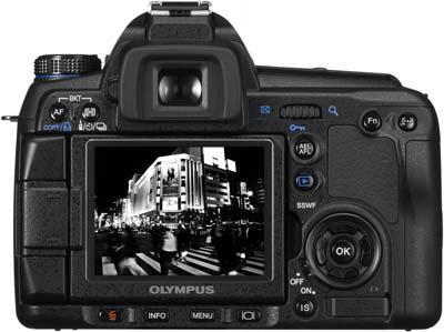 Il mirino offre una copertura del 98% dell'immagine con un ingrandimento pari a 1,02x. Anche il display da 2,7" snodato sul retro può fungere da sistema di puntamento, grazie al sistema Live-View con autofocus a contrasto. Il sistema autofocus a contrasto di fase nel mirino utilizza 11 punti di messa a fuoco a croce e promette velocità in linea con quelle offerte dalla E-3.