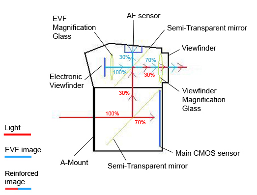 Meno chiare sono le informazioni in merito allo specchio semitrasparente, che potrebbe essere essere utilizzato sulla nuova Alpha 77, erede alla reflex Alpha 700: un nuovo elemento traslucido dovrebbe inviare parte della luce diretta al sensore autofocus all'oculare creando così un mirino ibrido ottico-eletronico, sovrapponendo l'immagine reale a quella Live-View.