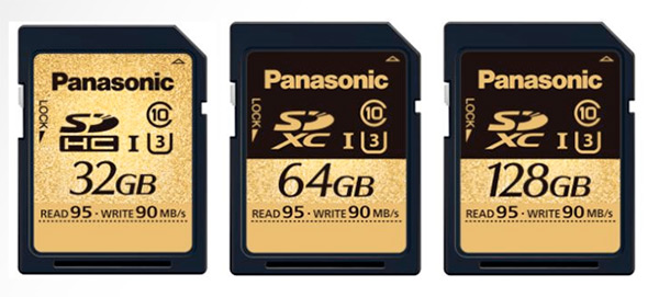 Panasonic ha presentato invece le nuove schede di memoria SDXC/SDHC di tipo UHS-I, capaci di offrire velocità di lettura fino a di 95MB/s e di scrittura massima di 90MB/s. Inoltre, sono compatibili con lo standard UHS classe di velocità 3 (U3). La nuova lineup è costituita da 3 formati: 32GB, 64GB e 128GB.