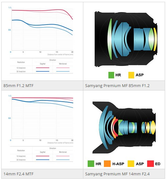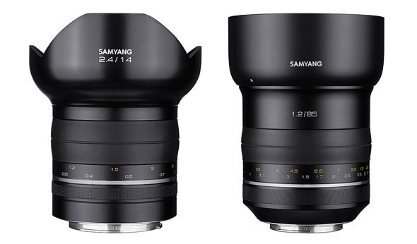 A giudicare dal peso c'è davvero tanto vetro in entrambe le ottiche, con l'85mm che ferma l'ago della bilancia a 1050 grammi e il grandangolo a 791 grammi. Il primo utilizza uno schema ottico da 10 lenti in 7 gruppi, tra cui una lente asferica e due ad alta rifrazione, con diaframma a 9 lamelle e diametro porta filtro da 86mm. Il secondo conta ben 18 elementi in 14 gruppi, ha un diaframma a 9 lamelle ed è privo di filettatura porta filtri. In questo caso le lenti in vetro speciale sono di 4 tipi: due asferiche, una ad alta rifrazione, due asferiche e una ibrida asferica. Samyang dichiara di aver lavorato per ridurre al minimo le aberrazioni. Per la costruzione delle ottiche il produttore coreano ha scelto l'alluminio, optando per un design curvo e smussato, in completa discontinuità con le serie precedenti (qualcuno ha detto Milvus???). I prezzi non sono stati ancora annunciati, ma la disponibilità inizierà prima della fine dell'anno, per ora le specifiche riportate mostrano il solo innesto Canon EF.