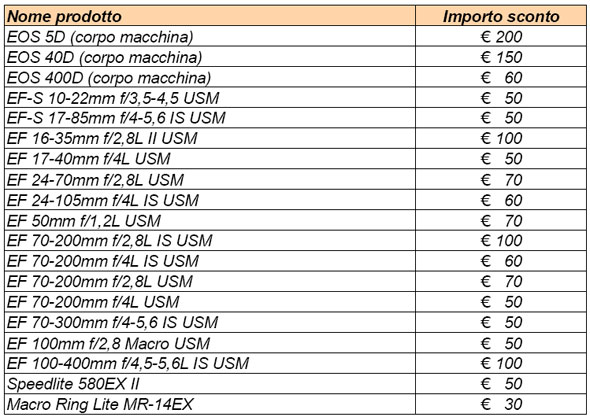 L’offerta, che consiste in un 'cash-back' dopo l’acquisto, e abbraccia quasi tutta la gamma, dalla entry level EOS 400D con una restituzione di € 60, alla EOS 40D che prevede un recupero di € 150, fino ad arrivare alla EOS 5D, reflex pieno formato che potrà beneficiare di uno sconto di € 200.