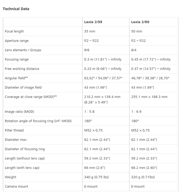 Loxia 2/35 (35mm F2) si basa sullo schema ottico Biogon ed è costituito da 9 lenti in sei gruppi. La distanza minima di messa a fuoco è pari a 30cm. Loxia 2/50 (50mm F2) utilizza invece lo schema Planar ed è costituito da sei elementi in quattro gruppi, con una distanza minima di messa a fuoco di 45 centimetri. La mancanza dell'autofocus li rende più compatti dei fratelli che invece ne fanno uso. Saranno mostrati dal vivo durante Photokina 2014, ma Zeiss ha già annunciato i prezzi: il 35mm costerà €965,55, mentre il 50mm €713,45.