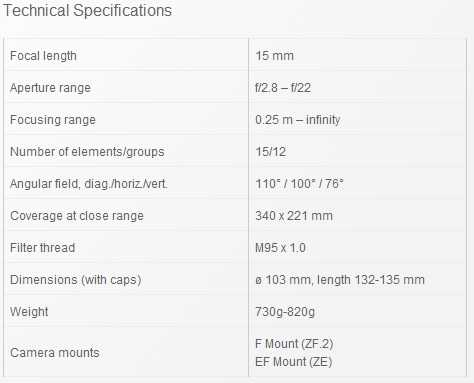 L'ottica offre un angolo di campo fino a 110° e una distanza di messa a fuoco minima pari a 25cm. Carl Zeiss promette un ottimo contenimento della distorsione, con prestazioni su questo fronte atipiche per una focale così ampia. Per il massimo contenimento delle aberrazioni cromatiche l'ottica integra due elementi asferici e utilizza un tipo di vetro con 'abnormal partial dispersion'.