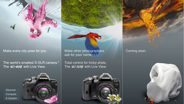 Come era già successo prima della presentazione delle sue due ultime reflex digitali, Olympus ha pubblicato un nuovo teaser sul proprio sito. La scorsa volta, come vi avevamo documentato nella notizia pubblicata a questo indirizzo, si vedevano nel buio le sagome di tre reflex, di cui due si sono poi svelate essere la E-410 e la E-510, arrivate sul mercato.