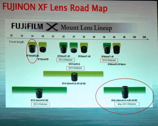 L’ottica, evidentemente con attacco X Mount, sarà stabilizzata e dotata di un diaframma a 7 lamelle arrotondate. Tra le caratteristiche spiccano inoltre il peso, 580g, non poco per un ottica dedicata ad un sistema mirrorrless, e il diametro dell’attacco per i filtri, 62mm anziché 58mm come il 18-55mm. Nella roadmap mostrata da Fuji la data di uscita dell’ottica è prevista per Maggio ma la casa dovrebbe portare sul mercato durante il 2013 anche altri tre obiettivi a focale fissa ed un terzo zoom per coprire anche le focali più grandangolari.