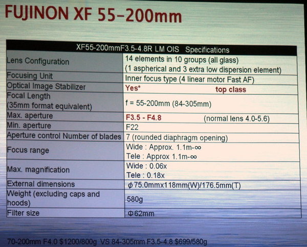 Dopo aver puntato molto su ottiche a focale fissa, Fuji ha introdotto da qualche mese lo zoom XF 18-55mm F2.8-4, apprestandosi ora a portare sul mercato uno zoom in grado di coprire focali più lunghe. Il nuovo XF 55-200mm f/3.5-4.8R LM OIS, la cui focale equivalente al pieno formato è pari a 84-305mm, sarà costituito da 14 elementi in 10 gruppi; tra le lenti, tutte in vetro, si troveranno tre elementi a bassa dispersione ed una lente asferica.
