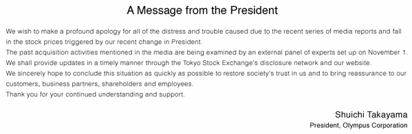 L'attuale presidente Shuichi Takayama, scaricando la colpa sul terzetto di dirigenti, afferma di non essere stato precedentemente al corrente dei fatti e non ha escluso di procedere in sede penale contro i tre. Sembrerebbe una cattiva abitudine consolidata in Olympus: i dirigenti avevano tenuto nascosto le perdite a partire dagli anni '90, anche utilizzando alcuni fondi delle acquisizioni per tappare i buchi e non far emergere il problema.