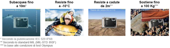 Arriva in Italia la Olympus Mju μ 1030SW, fotocamera che appartiene alla famiglia delle macchine fotografiche del produttore giapponese che funzionano anche sott'acqua, al gelo, che resistono a 100kg di peso o alle cadute accidentali.