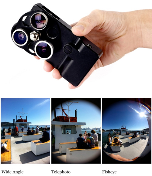 La ghiera girevole permette di utilizzare la fotocamera di iPhone 4 o 4S nuda, oppure di posizionarle davanti un teleobiettivo 1,5x, un grandangolo 0,7x oppure un fisheye 0,33x, per ampliare le possibilità creative a disposizione degli utenti.