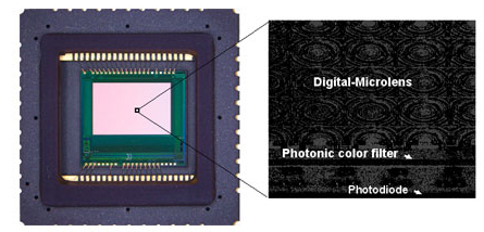 Le microlenti servono per concentrare una maggior quantità di luce nei diversi pixel del sensore, mentre i filtri RGB a comporre il mosaico utilizzato per rendere immagini a colori. La novità presentata da Panasonic prevede l'uso di microlenti digitali costruite in materiale inorganico, con un design ad anello. Ogni microlente può ricevere il design più corretto alla zona del sensore interessata; ricordiamo infatti che l'angolo di incidenza della luce è diverso tra il centro e la periferia del sensore, risultando, in caso di design uguale per tute le microlenti, in una cattura meno efficace della luce ai lati.