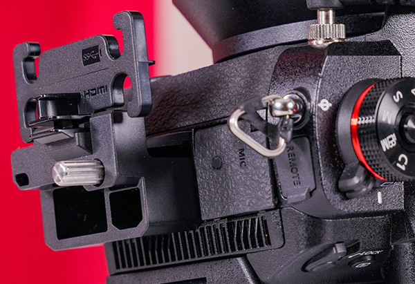 Di pregio è la confezione di vendita, non solo per la qualità dei materiali e della presentazione, ma anche per gli accessori inclusi di serie. Il caricabatterie può essere utilizzato a batteria estratta dal corpo, ma ha anche una presa USB-C per ricaricare l'accumulatore in macchina e per alimentare la macchina durante le lunghe riprese video. Accessorio molto interessante, che generalmente è opzionale è il sistema di blocco e protezione dei connettori USB-C e HDMI, quest'ultimo di dimensioni standard. Come avviene per i rig esterni, questo passacavi avvitabile sullo slot che integra i connettori, l'accessorio protegge da eventuali distacchi accidentali dei cavi e da problemi che possono emergere facendo leva sugli spinotti, rovinando i connettori. Nel video integrato a inizio pagina lo potete vede all'opera, dalle immagini è molto più chiaro il suo funzionamento.