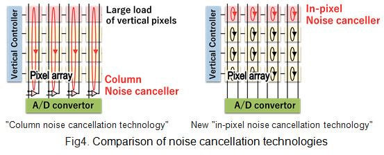 In una struttura di questo tipo, con connessioni metalliche tra i due strati possono originarsi problemi per il rumore definito 'reset noise', visto che non si riescono a leggere tutte le cariche generate: per ovviare il problema Panasonic ha sviluppato una tencologia di soppressione del rumore a livello del singolo pixel e non della colonna.