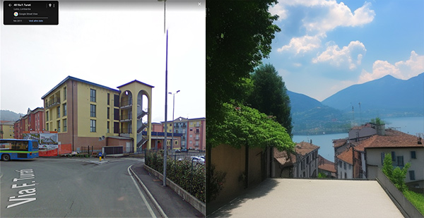 Per chi volesse provare, il designer ha anche creato una versione virtuale web utilizzabile via browser (a cui si può concedere l'utilizzo della propria posizione), anche se attualmente il numero eccessivo di accessi ha mandato il sistema in blocco. Non potendo sfruttare lo strumento 'originale', abbiamo provato a esportare il prompt e a darlo in pasto a un modello Stable Diffusion tramite l'interfaccia web AUTOMATIC1111, sia sfruttando Stable Diffusion 1.5 (la stessa versione chiamata dalle API della 'fotocamera') sia la versione 2.1. Il prompt relativo alla posizione dell'ufficio ha creato delle immagini in linea con la zona, ma molto più attinenti alle zone del paese sul lungolago.