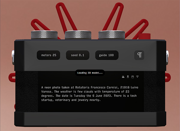 La 'fotocamera' offre sulla parte superiore tre ghiere che permettono di modificare il prompt. La prima è una sorta di zoom e controlla il raggio in metri dell'area da cui il sistema di creazione delle immagini può reperire informazioni.
