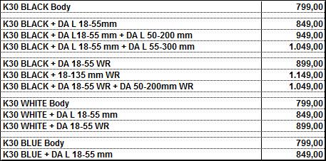 Pentax ha annunciato i prezzi ufficiali al pubblico della nuova PENTAX K-30, reflex che si fa notare nella fascia media per l'adozione di un mirino con pentaprisma a copertura integrale e per la presenza di una gran numero di guarnizioni contro acqua e polvere.