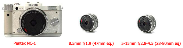 Pentax NC-1 dovrebbe utilizzare un sensore in formato 1/2,33" accreditato di 14 Megapixel e presentarsi dapprima con i due obiettivi in foto (un'ottica fissa di ampia apertura e uno zoom) ed essere seguita da una terza ottica dopo 2-3 mesi. Chi tra gli appassionati voleva un passo di Pentax nel settore delle mirrorless con ampio sensore non dovrebbe però rimanere deluso a lungo in quanto nei piani del produttore nipponico pare esserci anche una EVIL dotata di sensore APS-C.