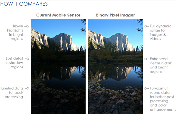 Nel primo caso la risposta di ogni fotodiodo viene modulata in base al raggiungimento di determinate soglie in modo da massimizzare la sensibilità quando i fotoni incidenti sono pochi ed evitare invece illa saturazione precoce quando il pixel è fortemente illuminato. A questa tecnologia si aggiunge un oversampling temporale, con più letture durante la singola esposizione: anche in questo caso si evita più facilmente la saturazione dei fotodiodi e si riesce a mantenere alta la sensibilità e l'amplificazione nelle zone scure dell'immagine. La tecnica dello Spatial Oversampling è simile come approccio a quanto visto con Nokia PureView e HTC Ultrapixel: in questo caso ogni pixel è suddiviso in sub-pixel, sempre con l'intento di avere un controllo più fine delle'esposizione nel singolo sito.
