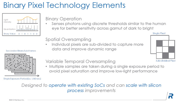 Rambus sta sviluppando la tecnologia Binary Pixel, che mira ad estendere in modo netto la gamma dinamica che un sensore è in grado di riprendere in real-time, senza post produzione. Al momento la compagnia ha costruito un proof-of-concept test-chip con cui sta mostrando la sua tecnologia ai diversi produttori, puntando molto sul vantaggio di poter integrare in modo semplice il proprio prodotto all'interno dei SoC attuali e dei processi produttivi utilizzati dall'industria. Sulla nostra pagina Facebook abbiamo pubblicato il video che mostra le potenzialità della nuova tecnologia, a confronto diretto con le prestazioni attuali: sempre con il beneficio del dubbio, ma vale la pena di essere visto, lo trovate a questo indirizzo.