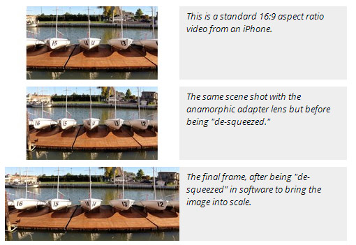 Il formato anamorfico nasce nel cinema negli anni '50 con il CinemaScope con l'intento di offrire una visione panoramica, senza bande nere sopra e sotto, pur utilizzando la normale pellicola 35mm e non i formati più larghi. In pratica una lente anamorfica permette di comprimere orizzontalmente l'immagine per far rientrare un'inquadratura panoramica nel formato 35mm e poi di riespanderla in fase di proiezione per far godere al pubblico il formato panoramico. Messo in pensione dall'evoluzione della tecnica sul finire degli anni '60 il formato anamorfico rinasce ora su iPhone.