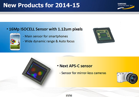 Interessanti anche i piani per il settore delle fotocamere con un nuovo sensore APS-C in fase di sviluppo. Da qualche tempo, infatti, le proposte mirrorless Samsung sono ferme al sensore da 20,3 megapixel, che equipaggia anche l'ultima nata Galaxy NX, la mirrorless con sistema operativo Android. Nel 2014 Samsung metterà sul piatto un nuovo sensore: sarà interessante vedere quale sarà la declinazione di modelli e soprattutto se il colosso coreano punterà anche in questo segmento a diventare fornitore di sensori per aziende terze, come già avviene per moltissimi componenti prodotti da Samsung e utilizzati dai concorrenti.
