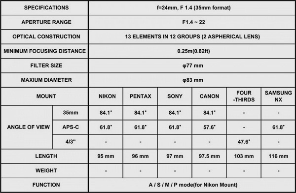 Da questa tabella si può dedurre l'angolo di visione della nuova lente in base al formato del sensore e al marchio dell'apparecchio. Si noti, ad esempio, come per il formato Quattro Terzi l'angolo di visione sia sensibilmente più stretto (47,6°) rispetto a quello offerto su corpi full frame (84,1°). Utilizzando il 24mm Samyang sulle full frame, quindi, avremo di fatto un grandangolo molto luminoso, mentre su corpi Quattro Terzi, visto anche il fattore di conversione 1:2, un comportamento più o meno da 50mm f/1.4. Ad oggi, come specifica anche Dpreview, non è ancora possibile conoscere il prezzo del nuovo obiettivo, ma siamo certi che non si tratterà di una cifra troppo elevata, nonostante l'ampia apertura.
