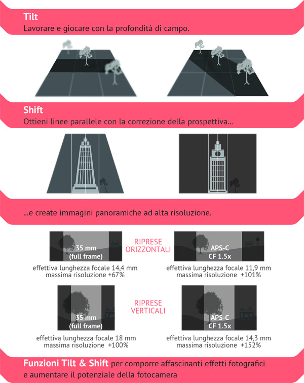La funzione Tilt-Shift dell'obiettivo permette un aggiustamento graduale dell'angolo sul piano focale (da -8,5 a 8,5 gradi) e lo spostamento parallelo dell'asse ottico dell'obiettivo di ± 12 mm. La sezione indicata responsabile di funzione tilt-shift può essere ruotata verso sinistra di 30, 60 o 90 gradi uno contro l'altro.