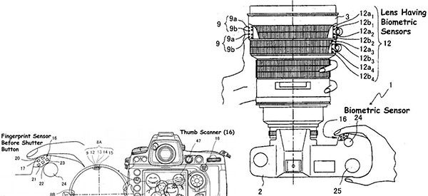 Il brevetto più particolare è però quello che inserisce diversi sensori biometrici sia sulla fotocamera sia sulle ottiche. Interessante provare a immaginare le possibili applicazioni. Macchine fotografiche senza più il selettore ON-OFF che si accendono automaticamente quando si appoggia l'indice sul pulsante di scatto o nella posizione di riposo adiacente. Fotocamere che riconoscono chi le sta usando e aggiustano di conseguenza tutti i parametri di scatto secondo le preferenze personali. Fotocamere 'antifurto', sbloccabili solo dall'utente con le giuste credenziali, come accade sui telefonini. Il brevetto Nikon mette i sensori di impronte anche sotto il display posteriore e sull'incavo per appoggiare il pollice. Non solo, i sensori nel brevetto appaiono anche sulle ottiche: secondo voi a cosa potrebbero servire?