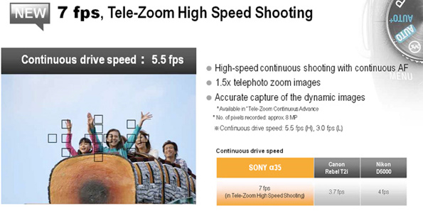 Proprio la tecnologia a specchio semitrasparente è la chiave di volta della strategia Sony, che si appresta al lanciare la terza SLT, Alpha A35. Le indiscrezioni che filtrano in rete posizionano questa nuova SLT entry level ben davanti alla concorrenza dal punto di vista della raffica. Lo scatto continuo arriverà a 5,5 fps, ma gli utenti potranno beneficiare anche di una modalità "1,5x telephoto zoom" che con un crop a 8 megapixel permetterà di allungare ulteriormente la focale equivalente e salire a 7 frame al secondo di raffica