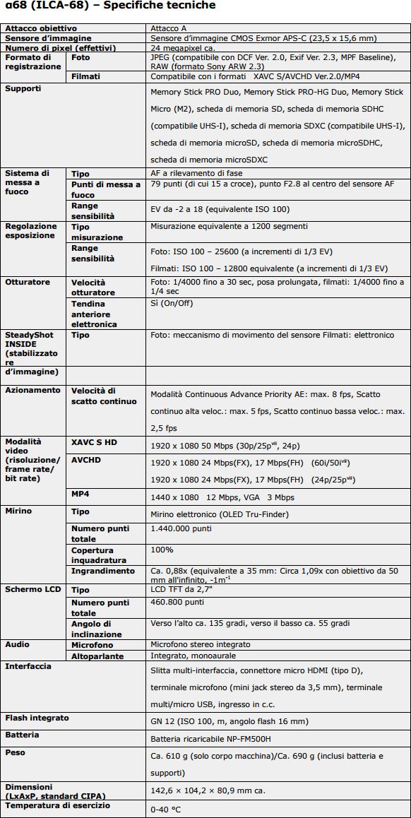 Come già visto per serie α7, sul lato posteriore è presente una ghiera di comando, che consente di regolare le impostazioni con semplici gesti delle dita. È inoltre possibile personalizzare ben 10 pulsanti per avere accesso immediato alle funzioni usate più frequentemente. Lo stabilizzatore interno SteadyShot INSIDE riduce gli effetti delle vibrazioni, come da tradizione Sony per questa tipologia di apparecchi. La fotocamera α68 con obiettivi intercambiabili a innesto A di Sony sarà disponibile a partire da marzo 2016, ad un prezzo non dichiarato che non ci permette di valutare con quali apparecchi concorrenti andrà a competere.