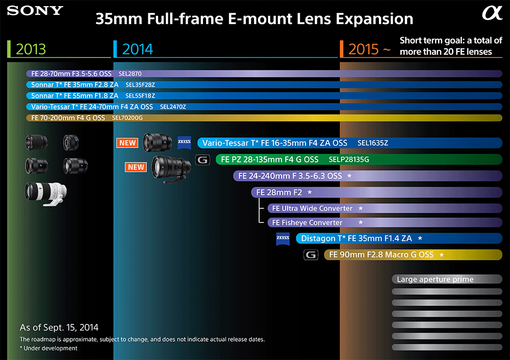 Il terzo modello, serie standard, è un superzoom 24-240mm f/3.5-6.3 OSS. Si tratta del classico obiettivo "da viaggio", che può far comodo in determinate circostanze, e che nella fattispecie, rispetto alle soluzioni classiche per Full Frame, rinuncia a parte del potenziale tele in favore di un grandangolo più ampio. Questo, secondo la roadmap, dovrebbe essere il primo obiettivo ad arrivare (era atteso già nel 2014), quindi il suo debutto dovrebbe essere ormai imminente.
