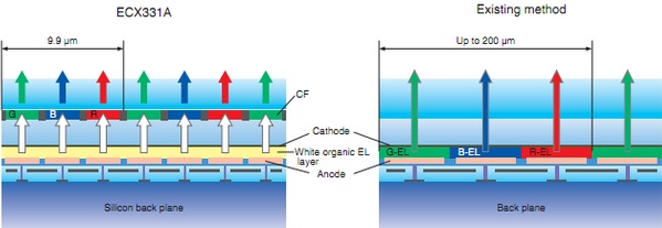Sony ha rilasciato i dettagli tecnici relativi ai display OLED che equipaggiano i mirini di Alpha A77 e A65 e della mirrorless Sony NEX-7. Non si tratta di display con pixel formati da emettitori organici colorati, ma si tratta di un approccio più simile a quello dei classici LCD: Sony ha infatti creato uno strato OLED elettroluminescente bianco, al quale ha sovrapposto un filtro a matrice colorata. Il risultato è un display di piccole dimensioni ad alta risoluzione che copre, stando a quando dichiarato da Sony nel suo PDF tecnico, il 90% del gamut NTSC, con un tempi di risposta pari a 0,01 millisecondi.