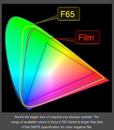 Il tono utilizzato da Sony è decisamente altisonante, ma stando ai dati pubblicati la nuova videocamera professionale F65 potrebbe rappresentare un vero punto di svolta per l'imaging video digitale. I dati di gamut, latitudine di posa e gamma dinamica dichiarati sono davvero interessanti: un gamut che si spinge oltre il triangolo disegnato dalla pellicola e 14 stop di gamma dinamica sono i dati che spiccano maggiormente.