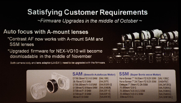A confermare un'attenzione degna da reflex di fascia alta, Sony ha messo al lavoro il proprio staff per risolvere alcuni problemi legati alla messa a fuoco delle lenti serie A se abbinati alle NEX con adattatore. E' atteso per metà novembre il rilascio ufficiale ti tale fix, che conferma anche l'intenzione di convogliare la clientela che già possiede una Alpha di fascia bassa o medio-bassa a valutare l'alternativa NEX, utilizzando le vecchie lenti.