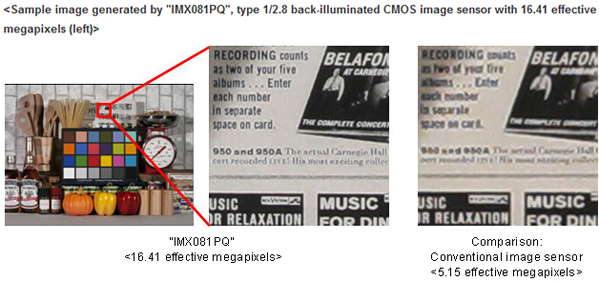 Il più piccolo dei due, denominato IMX105PQ, utilizza il formato 1/3,2" e offre 8,13 megapixel effettivi con una dimensione dei singoli pixel pari a 1.4µm. I 16,41 megapixel sono invece messi a disposizione dal sensore IMX081PQ, marchiato Exmor R, in formato leggermente più grosso, 1/2,8", ma caratterizzato da una dimensione dei pixel ridotta, che arriva fino al valore di 1.12μm, che Sony dichiara essere il minore del panorama attuale.