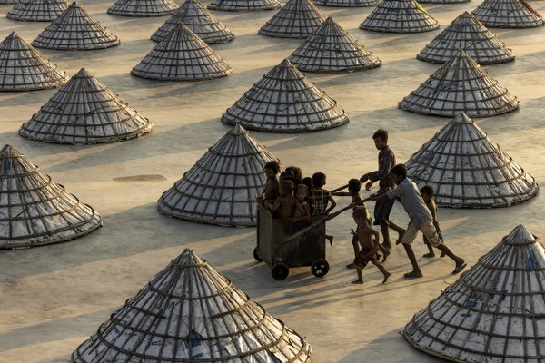 Azim Khan Ronnie (Bangladesh) per Childhood; l’immagine coglie alcuni bambini che si destreggiano tra decine di coni giganti (topas) in una piantagione di riso del Bangladesh, mentre giocano con un carrello usato dai lavoratori per trasportare ed essiccare il riso.