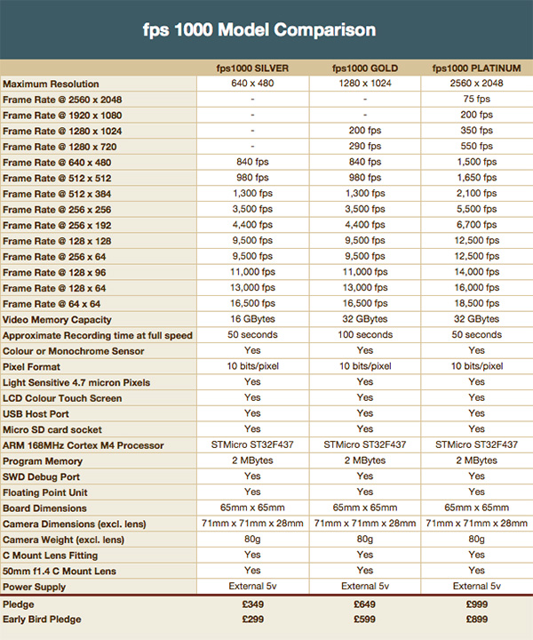 Ora su Kickstarter è attivo un nuovo progetto di crowd funding, con un obiettivo simile, ma che vuole questa volta portare le riprese ad alta velocità davvero alla portata di tutti. I prezzi della nuova fps1000 sono effettivamente un ordine di grandezza inferiori e partono da £350 per la versione base, arrivando fino a £1000 per la top di gamma. Anche i fondi necessari per l'avvio del progetto sono molto inferiori, solo ventimila sterline.
