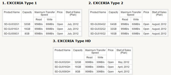 A chiudere la serie troviamo Exceria Type HD (colore rosso): la velocità di scrittura è di 30MB al secondo, mentre quella di lettura si assesta sui 90MB al secondo. I tagli disponibili saranno di 8GB, 16GB e 32GB, disponibili fra aprile e maggio.