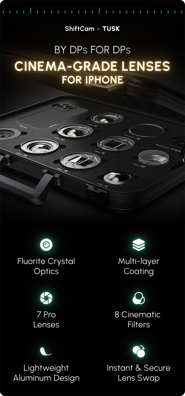 La compagnia di produzione Tusk, in collaborazione con ShiftCam, ha presentato Cinema Series, descritto come un nuovo sistema di ottiche e filtri di qualità cinematografica progettato specificamente per i modelli di iPhone di fascia alta, tra cui iPhone 15 Pro Max e iPhone 16 Pro Max.