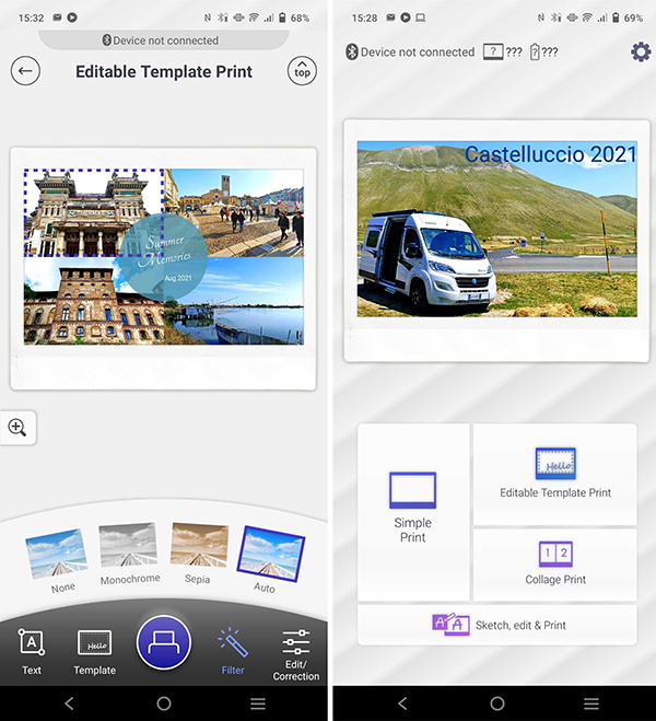 Rispetto alle precedenti stampanti, come la SP-03, si è poi decisamente evoluta sul fronte dell'app, ora più flessibile nell'uso, con la possibilità di effettuare non solo modifiche alle foto, ma anche di creare collage, con l'ulteriore opzione di sfruttare tutta una serie di template preimpostati personalizzabili, oltre che di template creabili da zero a piacere.