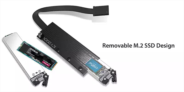 L'alloggiamento è compatibile con diversi tipi di SSD M.2 (2230/2242/2260/2280/22110) e supporta i protocolli PCIe 3.0 x2 per trasferimenti fino 16Gbps. Non c'è il supporto a PCIe 4.0 e PCIe 5.0, ma le velocità di trasferimento sono di gran lunga superiori a quelle necessarie per scrivere su disco anche i formati video a maggiore risoluzione e frame rate.