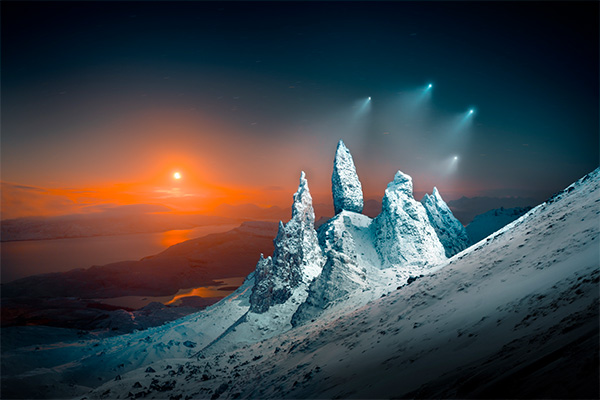 Liam Man è stato premiato per l'immagine intitolata Moonrise Sprites over Storr, che ritrae la nota formazione rocciosa dell'Old Man of Storr, sull'Isola di Skye, in Scozia, illuminata dalle luci di un flash montato su un drone e dalla luna arancione crescente. Realizzato in piena notte, durante un’impetuosa tempesta di neve, questo scatto cattura la vastità del paesaggio montuoso e lo stupefacente cielo invernale.