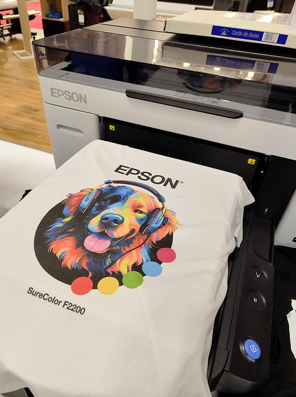 Epson ha messo in mostra sia stampanti fotografiche, di piccolo e grande formato, sia una stampante per DTG per la stampa diretta su tessuto che ha rappresentato una delle novità di rilievo della fiera SureColor F2200, che ha trovato subito applicazione negli stand di diversi partner direttamente in fiera, con molte installazioni.