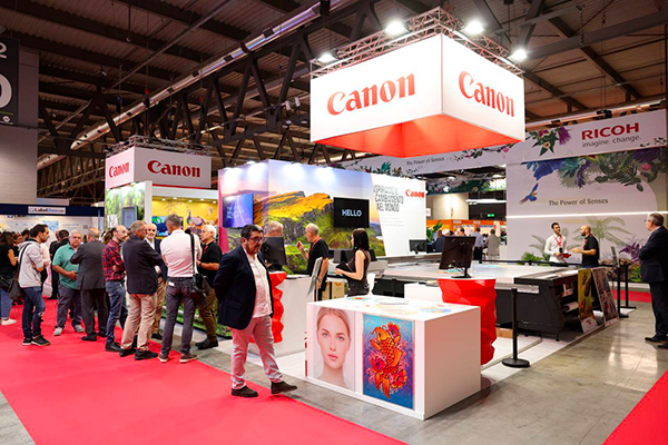 Stesso approccio, naturalmente, anche da parte di Canon, che ha approfittato per mettere in mostra anche soluzioni molto particolari decisamente cross-platform. Un esempio è certamente l'utilizzo delle fotocamere mirrorless della casa giapponese per creare, con la particolare ottica RF 5.2mm F2.8 L Dual Fisheye, la riproduzione degli interni di una casa visitabile in realtà virtuale, con la possibilità di cambiare gli oggetti di arredamento in base a quelli (ad esempio la carta da parati, ma anche un divano) stampabili con le stampanti per arti grafiche Canon e avere un'idea dell'effetto finale. La porzione centrale dello stand Canon era dedicata a tutte le soluzioni di stampa 'materiche' con in mostra tutti gli oggetti che è possibile ottenere sfruttando la stampa in rilievo.